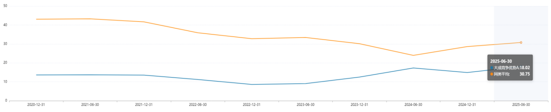 2020年末,大成竞争优势的持仓加权平均PE约为13.6倍,不到同类均值的32%;而到了2025年半年末,该产品的加权平均PE已上升至18倍,接近同类均值的近6成。