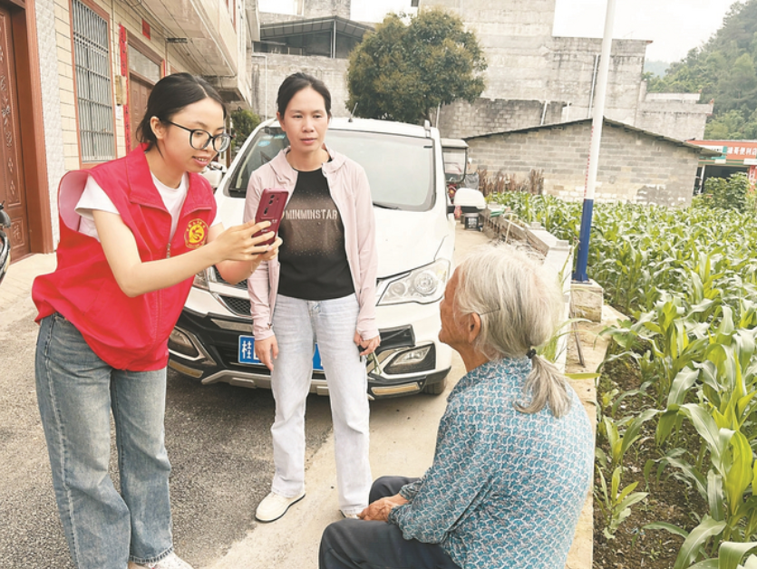 韦语红(左)在给村里的老人做养老认证。黄丽传 摄