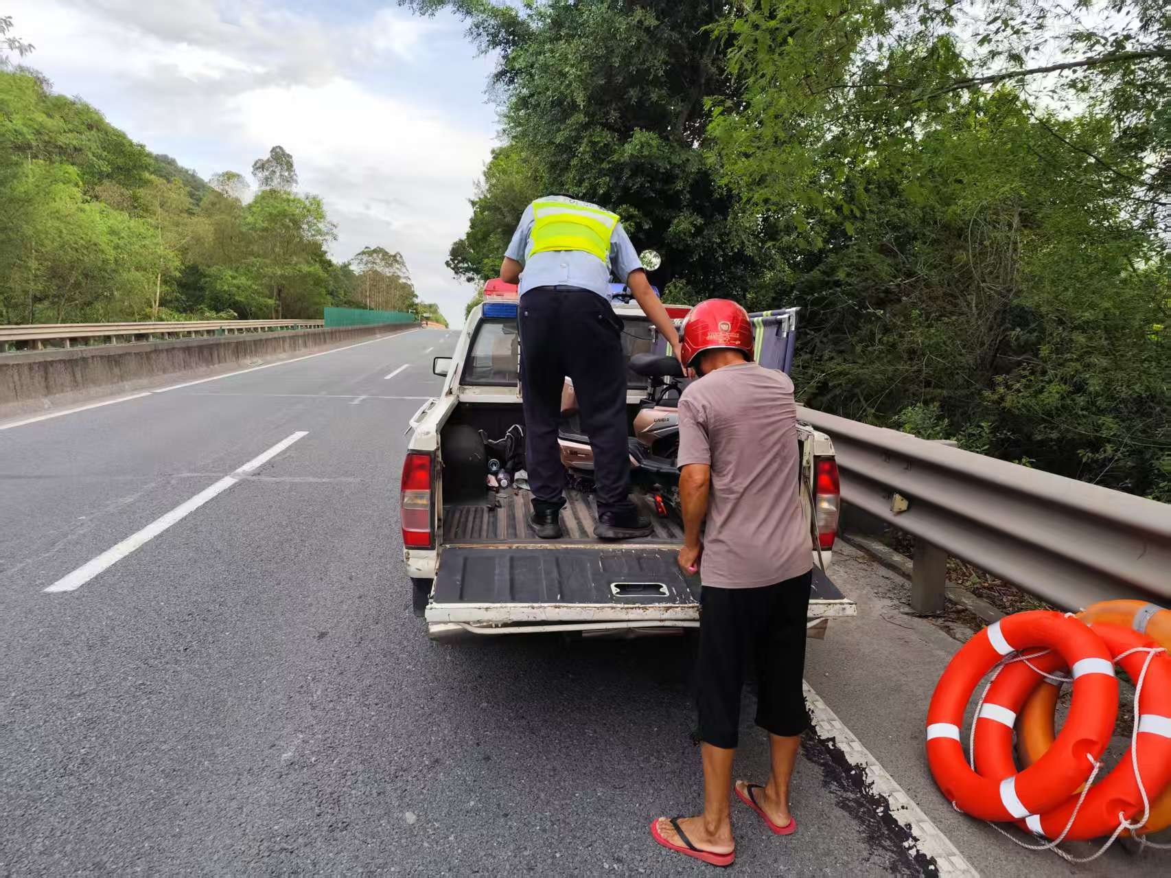 警员当即上前查看,经询问得知,该群众的电动车因爆胎无法骑行,需要推行车辆寻找维修店。考虑到该路段是国道,车流量密集,手动推车不仅效率低,还存在极大安全风险,当即决定启用警车协助转运。